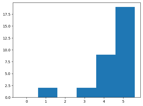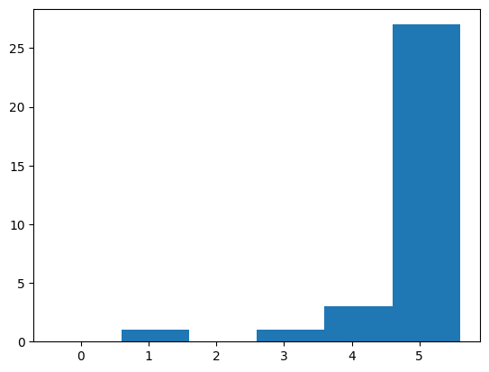 print_stats(res_array[:,:1])Results: [[5], [5], [5], [4], [5], [5], [3], [5], [5], [5], [5], [5], [5], [5], [5], [5], [5], [5], [4], [5], [5], [5], [5], [4], [1], [5], [5], [5], [5], [5], [5], [5]]