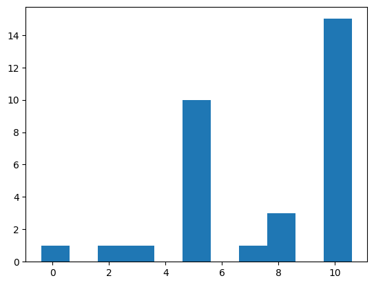 print_stats(res_array[:,2:3], bins = [x + 0.1 for x in range(-1, 11)])Results: [[5], [10], [5], [5], [5], [10], [2], [8], [5], [10], [8], [10], [8], [10], [10], [10], [5], [5], [10], [5], [7], [10], [5], [5], [0], [10], [10], [10], [10], [3], [10], [10]]