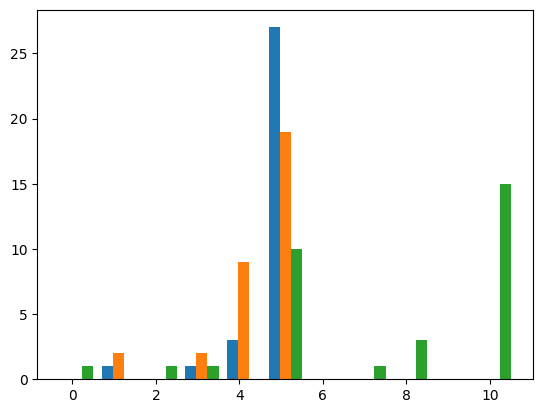 print_stats(res_array, [x + 0.1 for x in range(-1, 11)])Results: [[5, 5, 5], [5, 5, 10], [5, 5, 5], [4, 5, 5], [5, 4, 5], [5, 5, 10], [3, 1, 2], [5, 5, 8], [5, 5, 5], [5, 5, 10], [5, 5, 8], [5, 4, 10], [5, 5, 8], [5, 5, 10], [5, 5, 10], [5, 5, 10], [5, 4, 5], [5, 5, 5], [4, 3, 10], [5, 4, 5], [5, 3, 7], [5, 5, 10], [5, 5, 5], [4, 4, 5], [1, 1, 0], [5, 4, 10], [5, 4, 10], [5, 4, 10], [5, 5, 10], [5, 4, 3], [5, 5, 10], [5, 5, 10]]