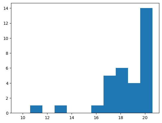 print_stats(f(np.sum(res_array, axis=1)), bins = [x + 0.1 for x in range(9,21)])Results: [17.5, 20.0, 17.5, 17.0, 17.0, 20.0, 13.0, 19.0, 17.5, 20.0, 19.0, 19.5, 19.0, 20.0, 20.0, 20.0, 17.0, 17.5, 18.5, 17.0, 17.5, 20.0, 17.5, 16.5, 11.0, 19.5, 19.5, 19.5, 20.0, 16.0, 20.0, 20.0]