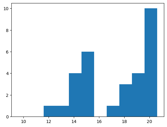 print_stats(np.sum(res_array, axis=1), bins = [x + 0.1 for x in range(9,21)])Results: [15, 20, 15, 14, 14, 20, 6, 18, 15, 20, 18, 19, 18, 20, 20, 20, 14, 15, 17, 14, 15, 20, 15, 13, 2, 19, 19, 19, 20, 12, 20, 20]